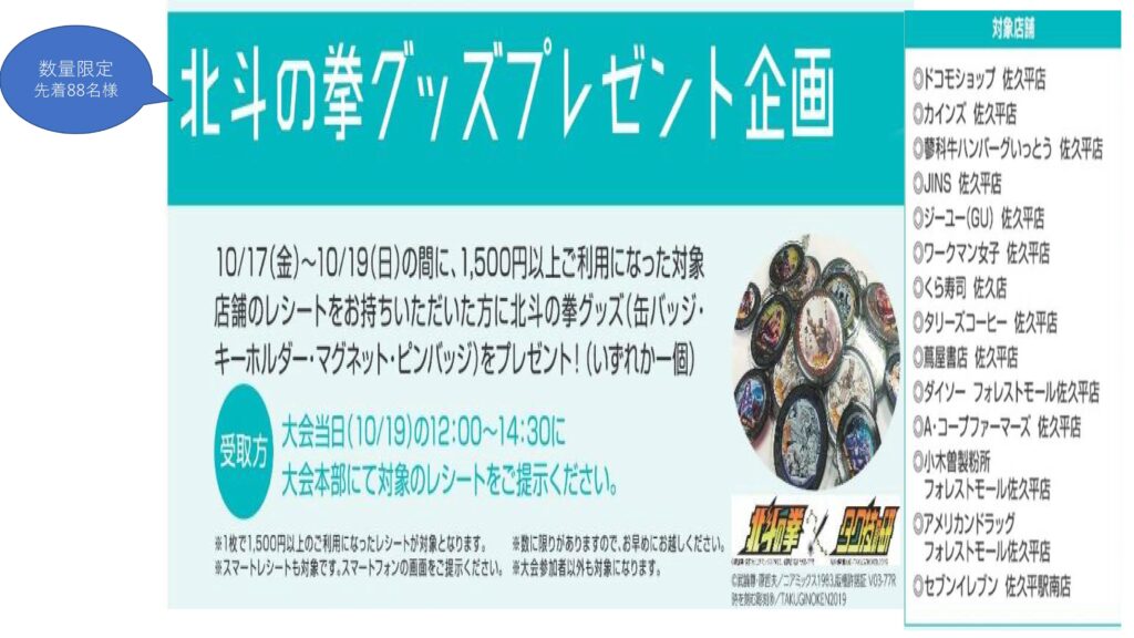 10/17(金)~10/19(日)の間に、1,500円以上ご利用になった対象店舗のレシートを大会本部(市民交流ひろば)にお持ちいただいた方に北斗の拳グッズ(缶バッジ・キーホルダー・マグネット・ピンバッジ)をプレゼントいたします。※いずれか1個